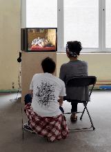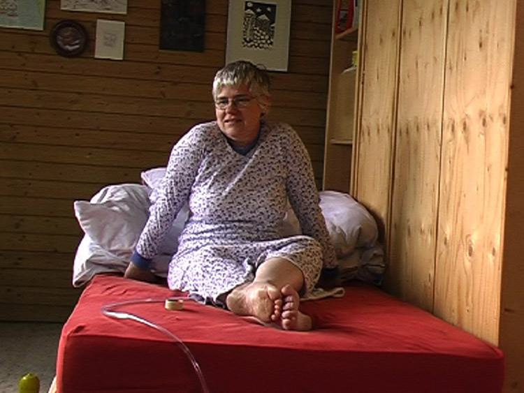 In the video “The Birth”, the artist’s mother, in a flower patterned nightshirt, is lying on a bed. Anna Witt enters the scene, sets an egg timer to nine minutes and crawls under her mother’s nightshirt. She stays there for a while lying on her mother’s belly until the timer rings. Her mother could blow air through a hose into her mouth. After the egg timer rang, she crawled out of the nightshirt.