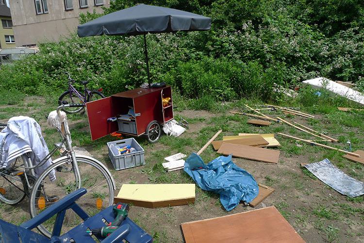 For the Emscherkunst, an public art event in the Rhine - Ruhr metropolitan, from June to October 2013, a performance took place in Duisburg Marxloh. The performers, a group of experienced crafts people from the region, worked in public space to build new street furniture out of found rubbish. The objects were created in the streets of suburban Marxloh. There, they were also left, free to use for the residents.