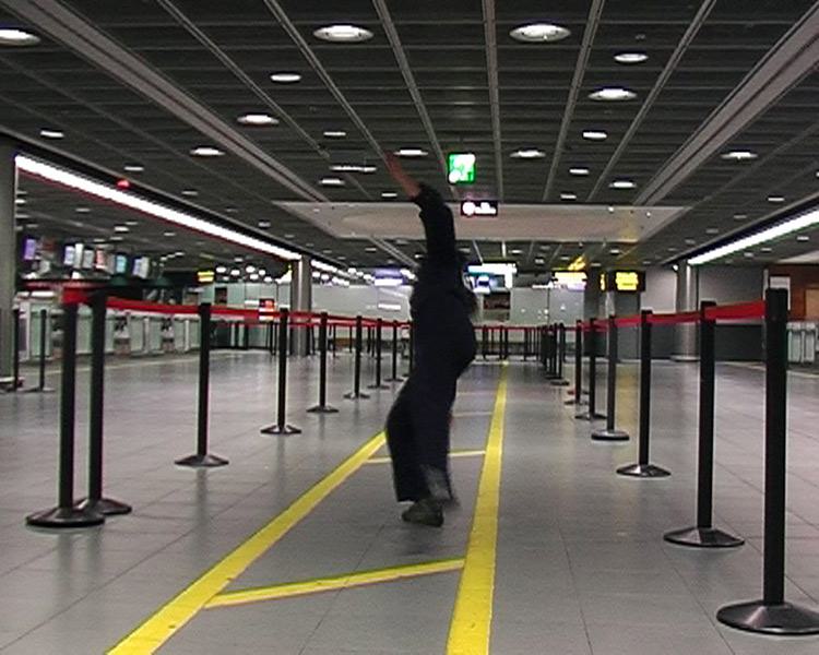 In “Field Test” Witt patroled the Dublin Airport. Some people were waiting for their flights and perhaps they could see an unexpected movement in the corner of their eye, while the artist practiced action stunts for the ‘big mission’. In her performance she played the role of a narrative figure, a heroic security guard who is taking his job a little bit too serious. Not knowing where the danger is coming from; she, as the Guard, is trying to fight against an invisible danger in the style of an action hero, but there is in addition always the underlying gesture of failure, boredom and insecurity.