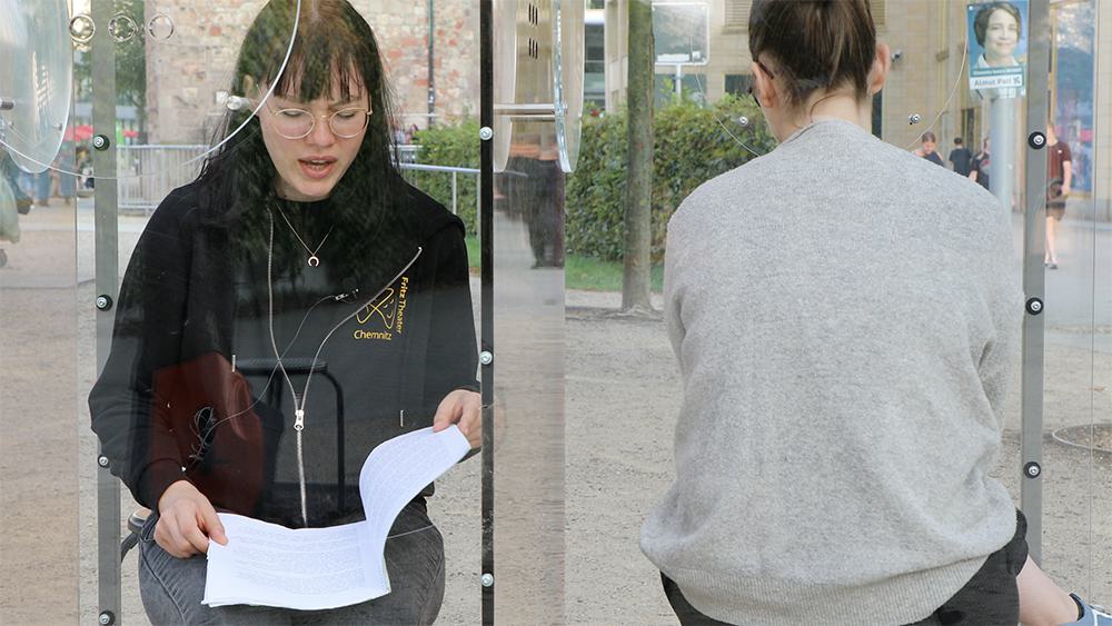 Older people from Chemnitz in particular know what it is like, to live under different types of political systems. The experiences they had with their civil rights back then, and what their attitudes are to their rights today, are also included in this project, as are the experiences of people from very different socio-economic, political, and cultural backgrounds. Installed Am Wall, a central location in the inner city, was an architectural sculpture that served as a meeting place for performances involving readings. During regular opening hours over the course of the ten-week-long exhibition, visitors had the opportunity to hear an actor or actress read passages from these conversational records personally to them. The transcriptions of the conversations between the artist and the participants have been made anonymous. They are excerpted from the chronological series and assembled into approximately five-minute-long textual collages on various themes. In a private meeting with the performer inside the architectural sculpture, located in the public space, visitors can have individual, spontaneously selected passages read out loud to them. The architectural sculpture was a pavilion made of transparent acrylic glass plates, and it functioned both as a divider and a connector. In terms of form and function, it recalls the kind of counter situation often found in government offices, which is being used more often to limit the spread of the COVID-19 virus in public places where people come into contact with each other. There were openings at various spots in the acrylic glass pavilion, so that the actors could be heard reading through the divider glass. Attached to these “speaking holes” were spit protectors made of magnifying glass lenses. Not only did they offer protection from saliva droplets, they also had enlarging properties, which upsets the sense of proximity, thus pointing out the changes in how we deal with each other in society, due to the challenges of battling the pandemic.
