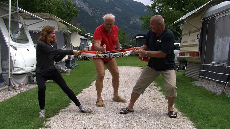 Wie identifiziert sich der Einzelne mit der Konstruktion des Staates? Wie entsteht ein Wir-Gefühl? Was ist mit der Geschichte? Wie wirkt sich die politische Lage auf das Nationalgefühl aus? Ausgehend von der Frage wie sich nationale Zugehörigkeit manifestiert, untersuchte ich im Mikrokosmos Campingplatz das Phänomen des sich "schmücken mit Nationalflagge". Im Laufe der Untersuchung zeigte sich dass die meisten keinen genauen Standpunkt dazu haben. "Es hat einfach mal einer mit den Flaggen angefangen". Ich entschloss, die Auseinandersetzung selbst zu thematisieren und forderte die Camper, unter Einsatz ihrer Fahne, zu einem sportlichen Wettkampf auf.