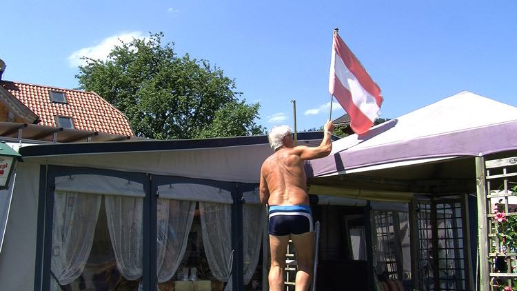 Wie identifiziert sich der Einzelne mit der Konstruktion des Staates? Wie entsteht ein Wir-Gefühl? Was ist mit der Geschichte? Wie wirkt sich die politische Lage auf das Nationalgefühl aus? Ausgehend von der Frage wie sich nationale Zugehörigkeit manifestiert, untersuchte ich im Mikrokosmos Campingplatz das Phänomen des sich "schmücken mit Nationalflagge". Im Laufe der Untersuchung zeigte sich dass die meisten keinen genauen Standpunkt dazu haben. "Es hat einfach mal einer mit den Flaggen angefangen". Ich entschloss, die Auseinandersetzung selbst zu thematisieren und forderte die Camper, unter Einsatz ihrer Fahne, zu einem sportlichen Wettkampf auf.