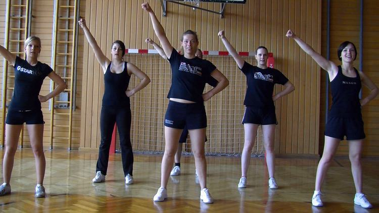 Seit Mitte der 90er Jahre etablierte sich „Radical Cheerleading“ als innovative Form des Straßenprotests. PolitaktivistInnen und FeministInnen eigneten sich Sprechrhythmus und Choreographie des Cheerleadings an, um ihren politischen Protest spektakulärer zu inszenieren. Für die Arbeit „Im Training“ stellte die Künstlerin einem Wiener Cheerleading Team die Idee des „Radical Cheerleading“ vor und motivierte sie, ihre Fähigkeiten zu nutzen, um eigene politische Inhalte zu vermitteln.