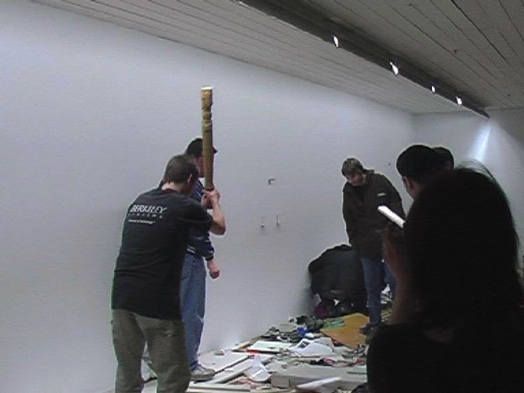 400 Euros were hidden in an installation which looked like an ordinary living room. The visitors were invited to look for the money regardeless of damage to the installation. If the money was found, it could be kept. The visitors formed the aesthetic process of the installation and became an active part of it. Emotionally, a precarious situation developed. Three hours after the opening the installation was totally destroyed and most of the money was found. Due to the location of the gallery, a much used subway station, the usual gallery guests mixed with people of different milieus. The apprehension at the beginning changed into a joyfull process of destruction. In 2008 the video “To find money” was made from the documentary material, which is not in chronological order. Its focus is the powerful atmosphere in the process of searching and destroying.