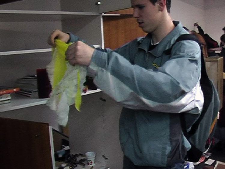 400 Euros were hidden in an installation which looked like an ordinary living room. The visitors were invited to look for the money regardeless of damage to the installation. If the money was found, it could be kept. The visitors formed the aesthetic process of the installation and became an active part of it. Emotionally, a precarious situation developed. Three hours after the opening the installation was totally destroyed and most of the money was found. Due to the location of the gallery, a much used subway station, the usual gallery guests mixed with people of different milieus. The apprehension at the beginning changed into a joyfull process of destruction. In 2008 the video “To find money” was made from the documentary material, which is not in chronological order. Its focus is the powerful atmosphere in the process of searching and destroying.