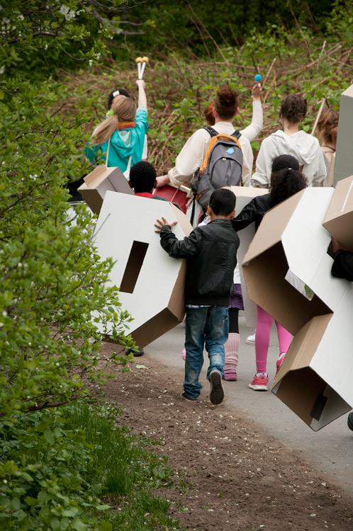 The project is connected to the idea of creating a platform for reflection in the form of a text. During a couple of weeks Anna Witt spent time in Hallonbergen, a sattelite town of Stockholm, speaking with people about their living conditions. After a while the conversations were extended to both a larger political context and to a possible future. Her response to these conversations has been formulated in a manifesto. Manifestoes are historically connected to a certain cultural scene or to a political agenda whereas the Hallonbergen manifesto voices a multitude of perspectives and levels. Concrete topics in Hallonbergen, private matters and global concerns face each other and create a private but at the same universal future agenda. Through the annotation like language, the address of the manifesto remains open. During the parade the manifesto was carried through the streets in a public performance that took the form of a choreography where participants where holding up sculptural letters. People gathered in different ways to formulate sentences so that the whole manifesto was delivered in parts as the parade moved through Hallonbergen.