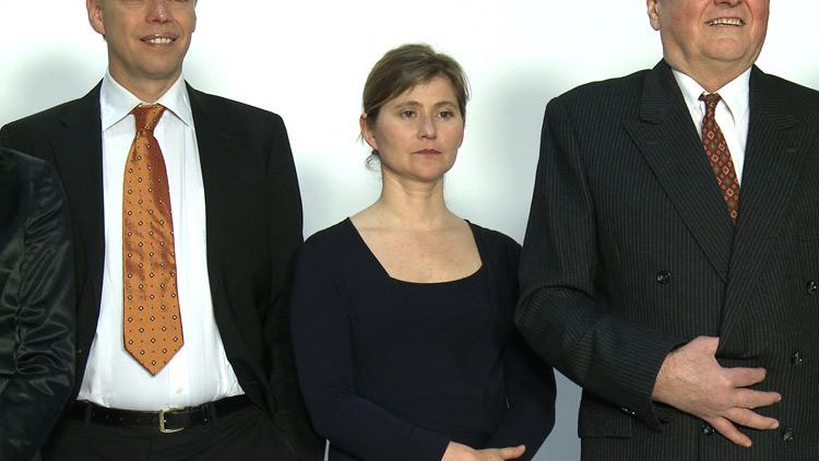 Sixty Minutes Smiling shows a group of officially dressed men and women standing in front of a neutral background. The persons could belong to the executive management of a company. Statically posing they look with a constant smile into the camera during the entire 60 minutes. Formally the work relates to Gillian Waering’s Sixty Minutes of Silence. However Witt is less interested in the dynamics within the group but in the emotional dynamics of each single person. In the second video channel Witt focuses on the facial expression of the protagonists. Hardly noticeable in the group image details and emotions become now apparent.