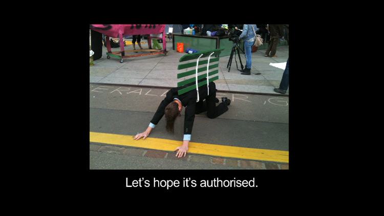 In The Rights of the Pavement Witt examines public forms of expression in our civil society. On view are visual forms of protest and their relation to judicial regulations. The video work shows found footage of political and artistic actions. In a voice-over one can hear an Austrian police press officer commenting on each situation. He explains the criminal delinquency and possible juristic consequences. Regulations for the sidewalk and consequently for the public space come increasingly to the fore.