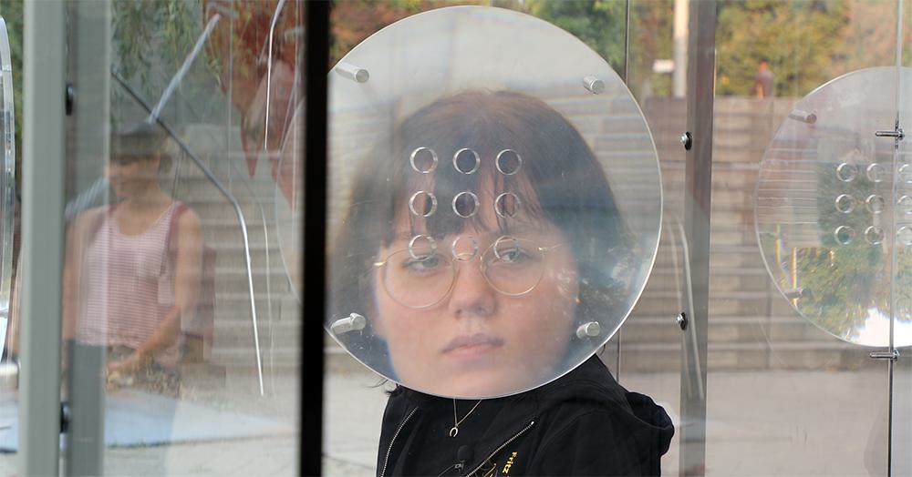 Older people from Chemnitz in particular know what it is like, to live under different types of political systems. The experiences they had with their civil rights back then, and what their attitudes are to their rights today, are also included in this project, as are the experiences of people from very different socio-economic, political, and cultural backgrounds. Installed Am Wall, a central location in the inner city, was an architectural sculpture that served as a meeting place for performances involving readings. During regular opening hours over the course of the ten-week-long exhibition, visitors had the opportunity to hear an actor or actress read passages from these conversational records personally to them. The transcriptions of the conversations between the artist and the participants have been made anonymous. They are excerpted from the chronological series and assembled into approximately five-minute-long textual collages on various themes. In a private meeting with the performer inside the architectural sculpture, located in the public space, visitors can have individual, spontaneously selected passages read out loud to them. The architectural sculpture was a pavilion made of transparent acrylic glass plates, and it functioned both as a divider and a connector. In terms of form and function, it recalls the kind of counter situation often found in government offices, which is being used more often to limit the spread of the COVID-19 virus in public places where people come into contact with each other. There were openings at various spots in the acrylic glass pavilion, so that the actors could be heard reading through the divider glass. Attached to these “speaking holes” were spit protectors made of magnifying glass lenses. Not only did they offer protection from saliva droplets, they also had enlarging properties, which upsets the sense of proximity, thus pointing out the changes in how we deal with each other in society, due to the challenges of battling the pandemic.