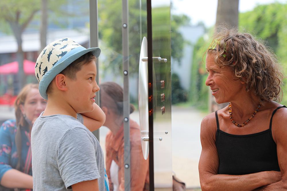 Older people from Chemnitz in particular know what it is like, to live under different types of political systems. The experiences they had with their civil rights back then, and what their attitudes are to their rights today, are also included in this project, as are the experiences of people from very different socio-economic, political, and cultural backgrounds. Installed Am Wall, a central location in the inner city, was an architectural sculpture that served as a meeting place for performances involving readings. During regular opening hours over the course of the ten-week-long exhibition, visitors had the opportunity to hear an actor or actress read passages from these conversational records personally to them. The transcriptions of the conversations between the artist and the participants have been made anonymous. They are excerpted from the chronological series and assembled into approximately five-minute-long textual collages on various themes. In a private meeting with the performer inside the architectural sculpture, located in the public space, visitors can have individual, spontaneously selected passages read out loud to them. The architectural sculpture was a pavilion made of transparent acrylic glass plates, and it functioned both as a divider and a connector. In terms of form and function, it recalls the kind of counter situation often found in government offices, which is being used more often to limit the spread of the COVID-19 virus in public places where people come into contact with each other. There were openings at various spots in the acrylic glass pavilion, so that the actors could be heard reading through the divider glass. Attached to these “speaking holes” were spit protectors made of magnifying glass lenses. Not only did they offer protection from saliva droplets, they also had enlarging properties, which upsets the sense of proximity, thus pointing out the changes in how we deal with each other in society, due to the challenges of battling the pandemic.