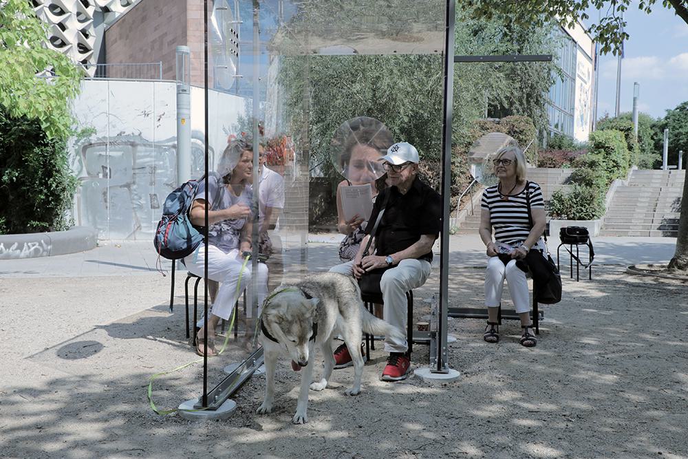 Older people from Chemnitz in particular know what it is like, to live under different types of political systems. The experiences they had with their civil rights back then, and what their attitudes are to their rights today, are also included in this project, as are the experiences of people from very different socio-economic, political, and cultural backgrounds. Installed Am Wall, a central location in the inner city, was an architectural sculpture that served as a meeting place for performances involving readings. During regular opening hours over the course of the ten-week-long exhibition, visitors had the opportunity to hear an actor or actress read passages from these conversational records personally to them. The transcriptions of the conversations between the artist and the participants have been made anonymous. They are excerpted from the chronological series and assembled into approximately five-minute-long textual collages on various themes. In a private meeting with the performer inside the architectural sculpture, located in the public space, visitors can have individual, spontaneously selected passages read out loud to them. The architectural sculpture was a pavilion made of transparent acrylic glass plates, and it functioned both as a divider and a connector. In terms of form and function, it recalls the kind of counter situation often found in government offices, which is being used more often to limit the spread of the COVID-19 virus in public places where people come into contact with each other. There were openings at various spots in the acrylic glass pavilion, so that the actors could be heard reading through the divider glass. Attached to these “speaking holes” were spit protectors made of magnifying glass lenses. Not only did they offer protection from saliva droplets, they also had enlarging properties, which upsets the sense of proximity, thus pointing out the changes in how we deal with each other in society, due to the challenges of battling the pandemic.