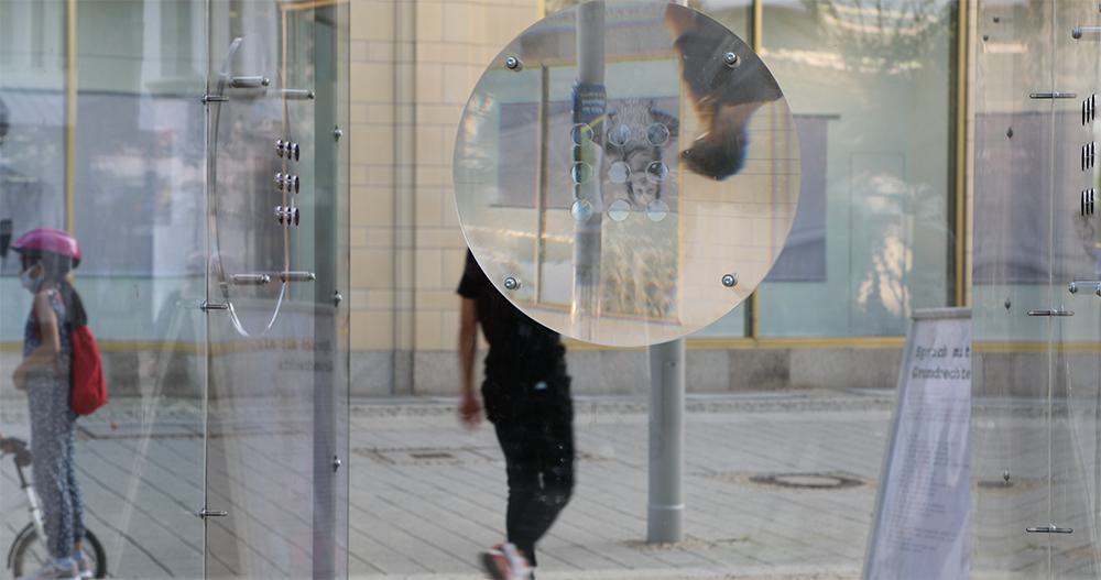 Older people from Chemnitz in particular know what it is like, to live under different types of political systems. The experiences they had with their civil rights back then, and what their attitudes are to their rights today, are also included in this project, as are the experiences of people from very different socio-economic, political, and cultural backgrounds. Installed Am Wall, a central location in the inner city, was an architectural sculpture that served as a meeting place for performances involving readings. During regular opening hours over the course of the ten-week-long exhibition, visitors had the opportunity to hear an actor or actress read passages from these conversational records personally to them. The transcriptions of the conversations between the artist and the participants have been made anonymous. They are excerpted from the chronological series and assembled into approximately five-minute-long textual collages on various themes. In a private meeting with the performer inside the architectural sculpture, located in the public space, visitors can have individual, spontaneously selected passages read out loud to them. The architectural sculpture was a pavilion made of transparent acrylic glass plates, and it functioned both as a divider and a connector. In terms of form and function, it recalls the kind of counter situation often found in government offices, which is being used more often to limit the spread of the COVID-19 virus in public places where people come into contact with each other. There were openings at various spots in the acrylic glass pavilion, so that the actors could be heard reading through the divider glass. Attached to these “speaking holes” were spit protectors made of magnifying glass lenses. Not only did they offer protection from saliva droplets, they also had enlarging properties, which upsets the sense of proximity, thus pointing out the changes in how we deal with each other in society, due to the challenges of battling the pandemic.