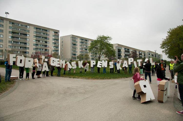 The project is connected to the idea of creating a platform for reflection in the form of a text. During a couple of weeks Anna Witt spent time in Hallonbergen, a sattelite town of Stockholm, speaking with people about their living conditions. After a while the conversations were extended to both a larger political context and to a possible future. Her response to these conversations has been formulated in a manifesto. Manifestoes are historically connected to a certain cultural scene or to a political agenda whereas the Hallonbergen manifesto voices a multitude of perspectives and levels. Concrete topics in Hallonbergen, private matters and global concerns face each other and create a private but at the same universal future agenda. Through the annotation like language, the address of the manifesto remains open. During the parade the manifesto was carried through the streets in a public performance that took the form of a choreography where participants where holding up sculptural letters. People gathered in different ways to formulate sentences so that the whole manifesto was delivered in parts as the parade moved through Hallonbergen.