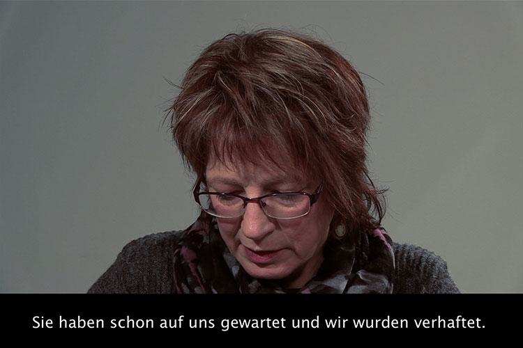 WALKING THROUGH WALLS-Part 1 includes a video of the first meeting of the two persons, in which they took protocol of each other`s story in a neutral, almost bureaucratic way. Both stories are told alternately at the same time and seem to blur into each other, as the speakers sometimes switch from their own story to the story of the other. The video is shown within a flexible pole construction and a selection of media images chosen by the protagonist.