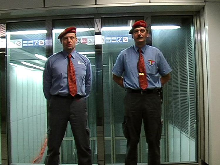 For the work “Team West – patrol with me!” the artist attended the security team of Vienna’s central station on their daily route. The men showed her their strategic points in the building, talked about special postures and gestures of a security guard and the importance of uniforms. Afterwards Witt established her own security team with loitering persons at the station. In their self made uniforms and in consideration of the strategies used by real security teams, the new team defined their appearance.